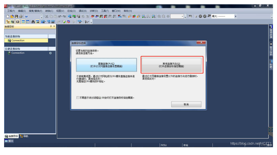 打开GXWORKS 3,点击当前连接目标下的【Connetion】,连接目标选择【其他连接方式】